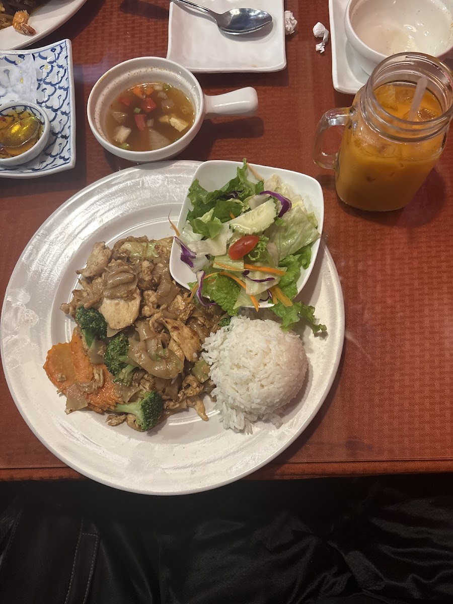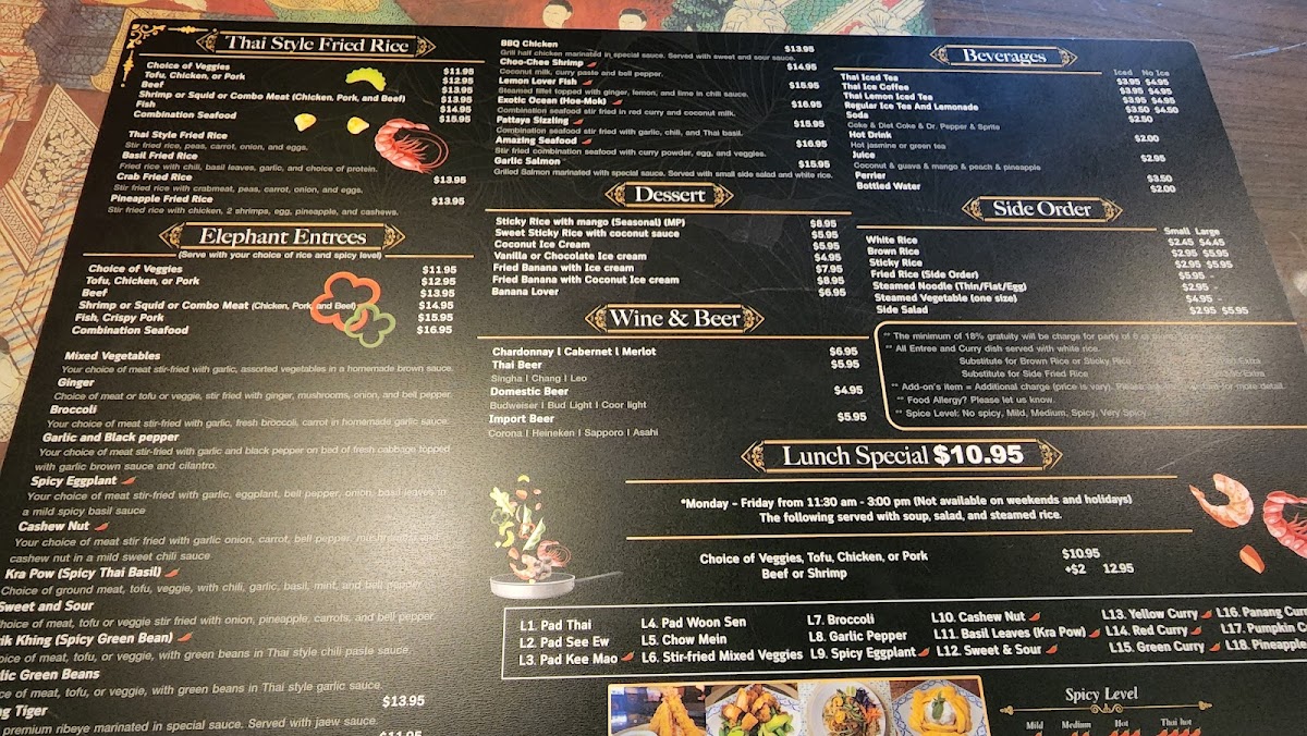 For a fresh twist, indulge in the Pineapple Fried Rice, where sweet and savory harmoniously meet. The menu also offers refreshing beverages such as the iconic Thai Ice Tea or the invigorating Thai Lemon Ice Tea, both priced at just $3.50. Additionally, if you’re looking to unwind, select from the variety of Thai beers like Singha or Chang, each priced at around $5.95, perfectly complementing your meal's flavors.