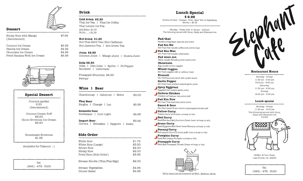 For reservations or inquiries, you can reach them at (+1) 949-472-3100. Experience the vibrant tastes of Thailand—visit Elephant Cafe today!